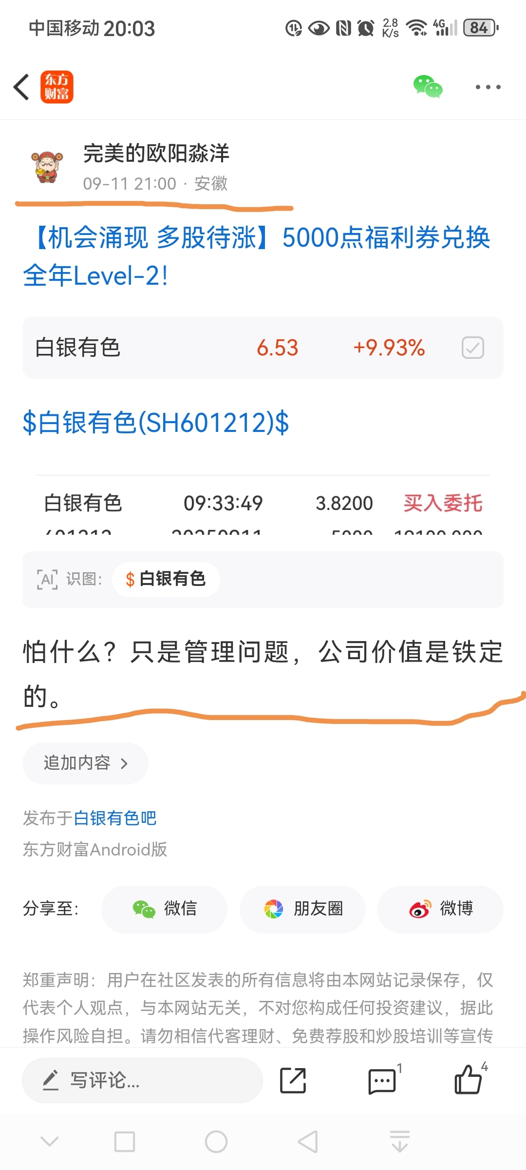 温馨提示: 1.根据《证券法》规定,禁止编造、传播虚假信息或者误导性信息,扰乱证券市场;2.用户在本社区发表的所有资料、言论等仅代表个人观点,与本网站立场无关,不对您构成任何投资建议。用户应基于自己的独立判断,自行决定证券投资并承担相应风险。《东方财富社区管理规定》