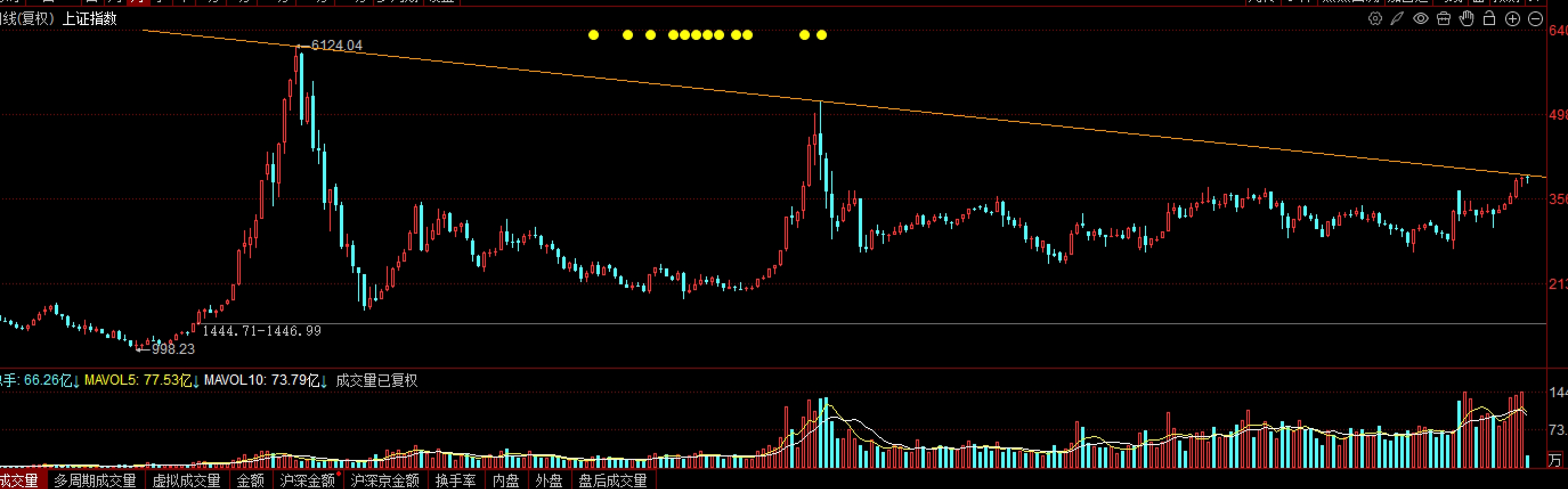 我在之前一直判断9月份收出小k窄幅震荡,10月会顺次收出中大阳线的,目前看来很明显的判断错误,行情还是难做。那么就是之前月k的走势图,这里是下跌压力线,在这里顺便开展二浪盘整就可以接受的了。可惜这里是上升通道,如果走出与上升走势相反的结构就更漂亮更有把握了。