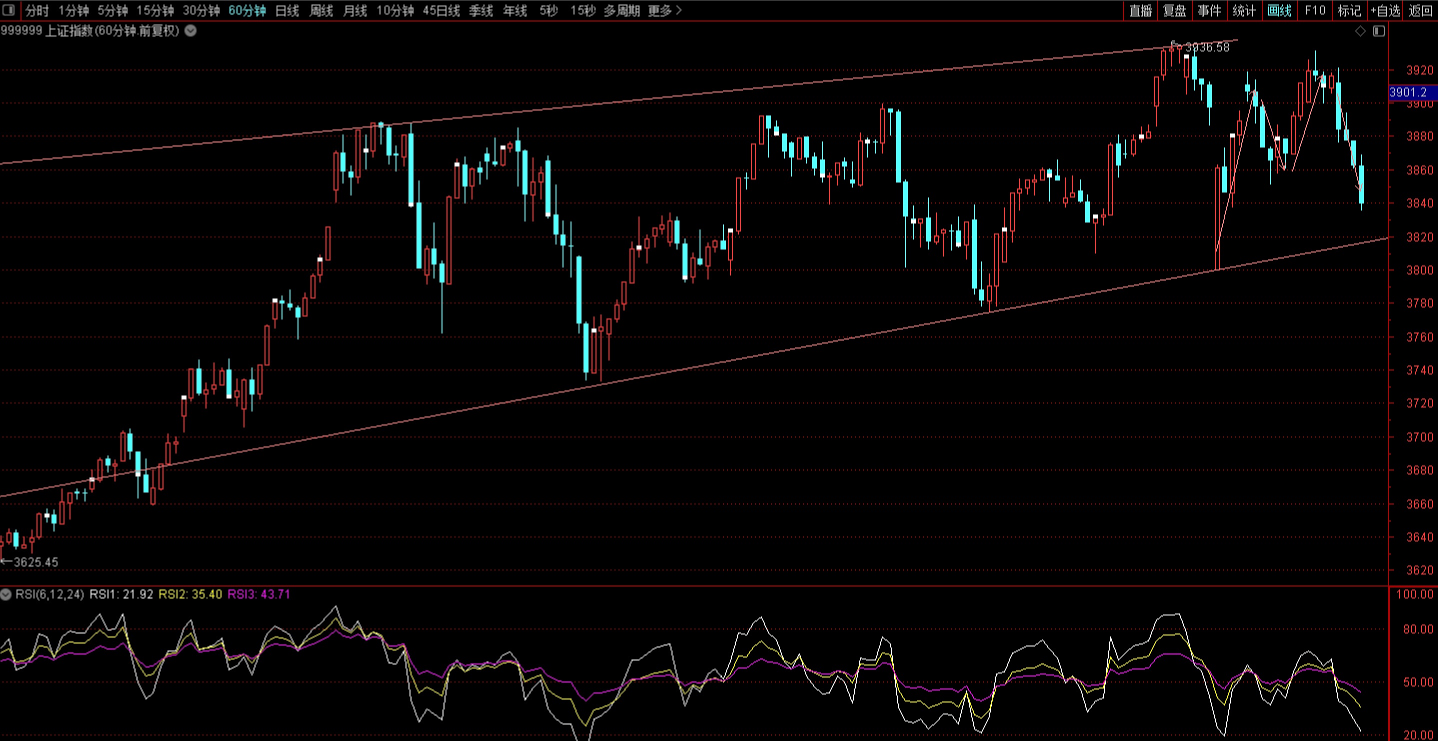 首先指数上,今天的大幅回落并不是很意外,只是今天速率比较大比较快而已。走势修正,指数在这里走出上升通道,前面的60分钟上三走势完整,上三之后就看下三,只是这个下三的一速度较快。在13号周末大利空的3800大低开,后面一路承接收上去,说明这里是有承接力量的。如果这里是见顶信号,就没有必要在13号做出承接,那是非常明显的增加仓位的盘口不用再托住了。第二是权重在动,在托着指数,而题材类调整,有护盘的意味在。那么是否代表着题材调整完,就会和权重一起共振向上开启新的一轮指数行情呢?