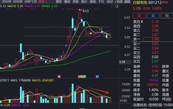 调整周期中,已连续跌破之前画出的两条防守位,按照之前的计划已进行了减仓操作。下一个防守位为4.62左右。当前量能不足,在没有站上中间保护线和ma5之前,少动多看。