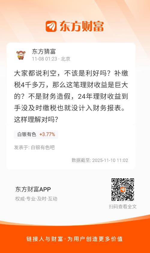 大家都说利空,不该是利好吗?补缴税4千多万,那么这笔理财收益是巨大的?不是财务造假,24年理财收益到手没及时缴税也就没计入财务报表。这样理解对吗?
