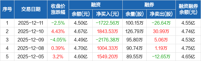 白银有色融资融券信息显示,2025年12月11日融资净偿还1722.56万元;融资余额4.5亿元,较前一日下降3.69%。