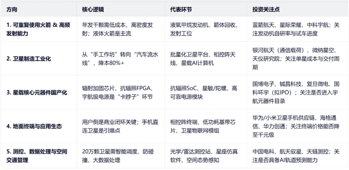 基于当前中美太空竞赛加速、中国大规模申报低轨卫星频轨资源的背景,结合产业链成熟度、政策导向与技术壁垒,现提炼出以下投资逻辑分析及重点看好的方向:
