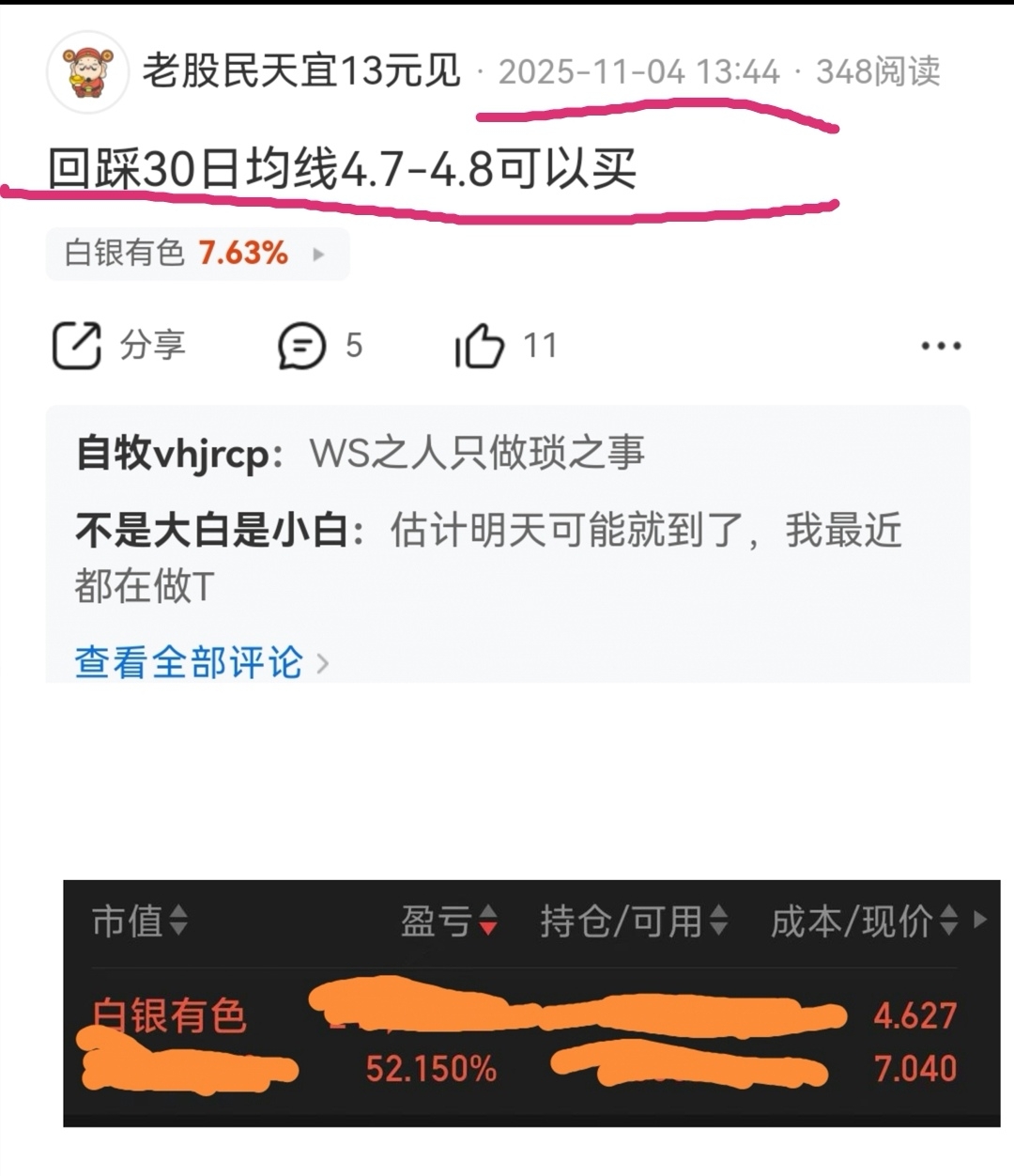 $白银有色(SH601212)$ 我是老股民。10月清仓白银后。11月份就多次发帖提醒大家4.7附近接回来。提醒元旦后有大三浪。大方向正确。很多粉丝关心这波白银有色去到多少可以减仓。我直接说重点:7.5附近可以减仓。什么时候加回去。到时通知大家。信我粉丝严格执行就行了。以上仅供参考不做投资建议风险自担。