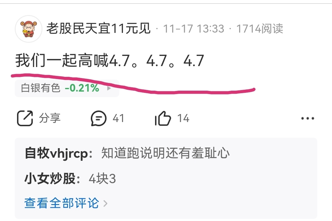 我是老股民。10月清仓白银后。11月份就多次发帖提醒大家4.7附近接回来。提醒元
