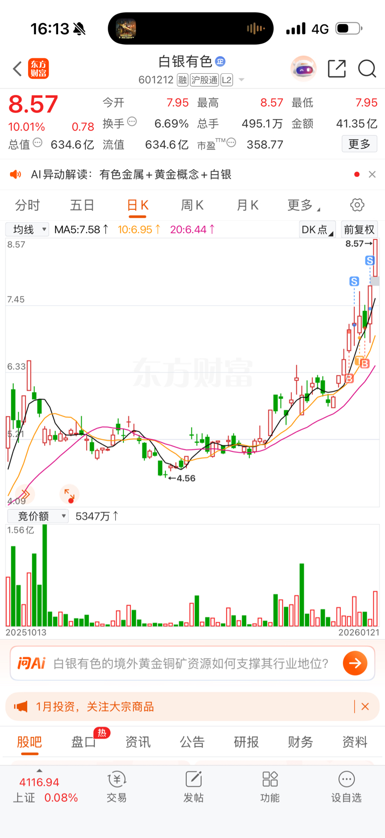 $白银有色(SH601212)$ $豫光金铅(SH600531)$ $湖南白银(SZ002716)$ 昨天两个白银卖飞了、少吃一个板、今天没买进去,一样看好白银和黄金可以看下豫光金铅,白银产量1700吨好像比白银有色和湖南白银加起来都多、黄金产量也不错,值得关注