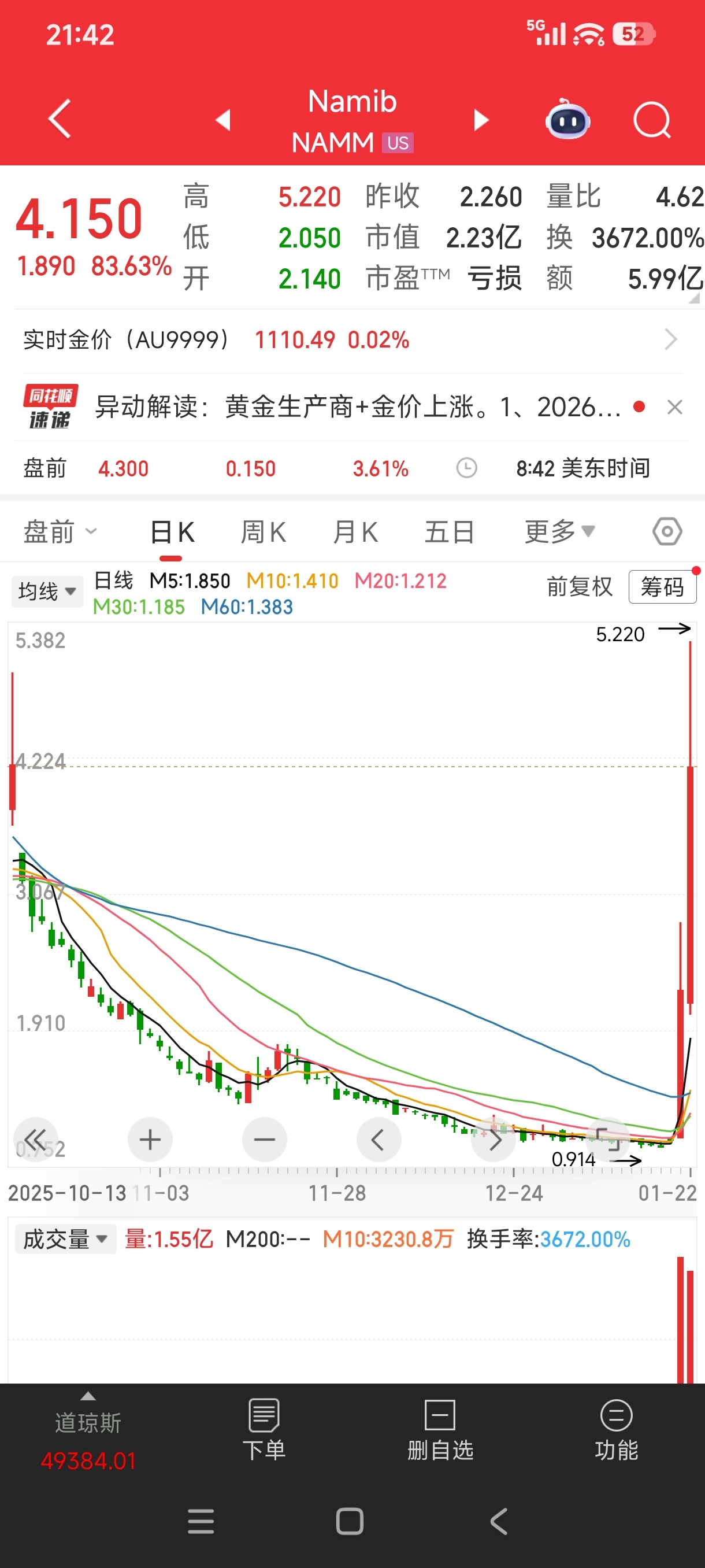 本座!发一张老美的黄金股前二天涨幅!让乡巴老空空!开开眼!这只股也是只亏损仙股!