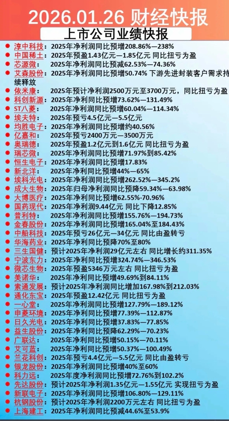 1.26周一晚间上市公司业绩汇总!有多只股票业绩预降或亏损,短期回避。