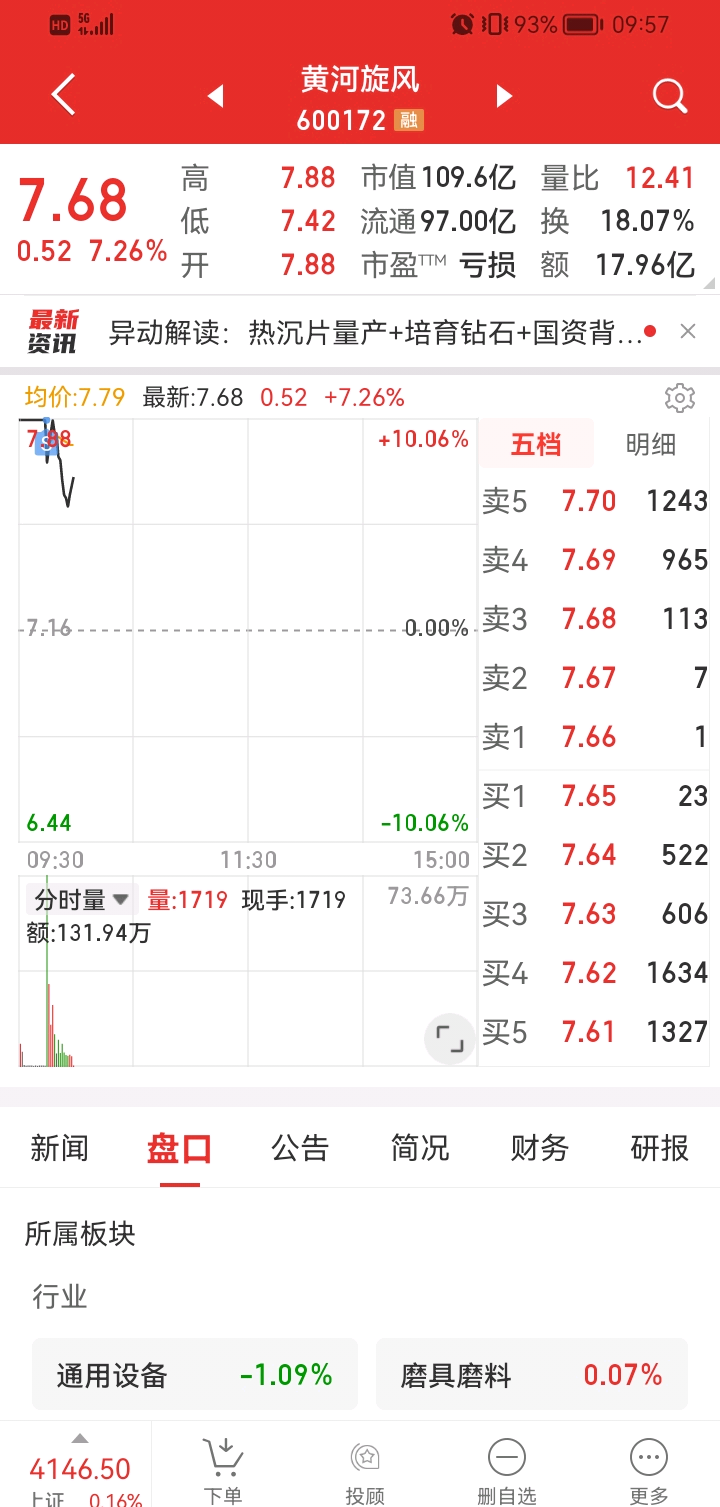 昨天中国黄金三涨停,黄河旋风也跟着涨停,烂板都没出,今天都开一字板,结果黄金概念一路狂飙,培育钻石一路下跌,气死了