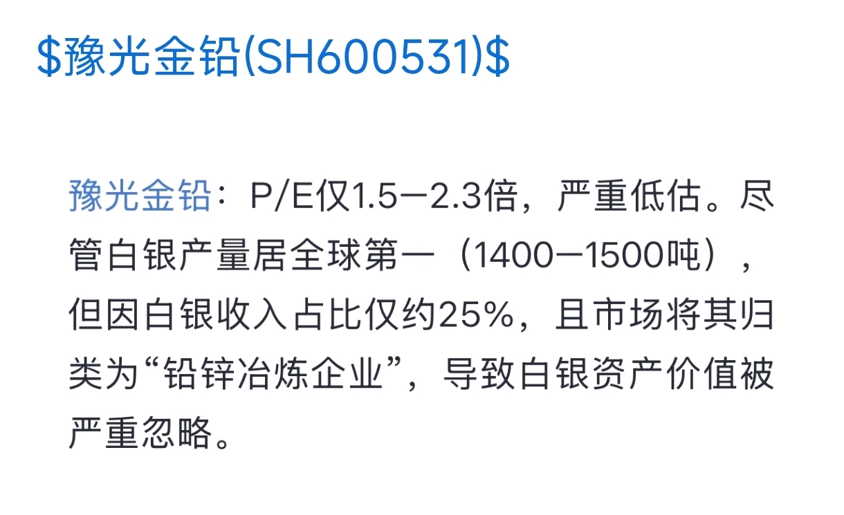 光金铅:P/E仅1.5-2.3倍,严重低估。尽管白银产量居全球第一(1400-1500吨),但因白银收入占比仅约25%,且市场将其归类为"铅锌冶炼企业",导致白银资产价值被严重忽略。