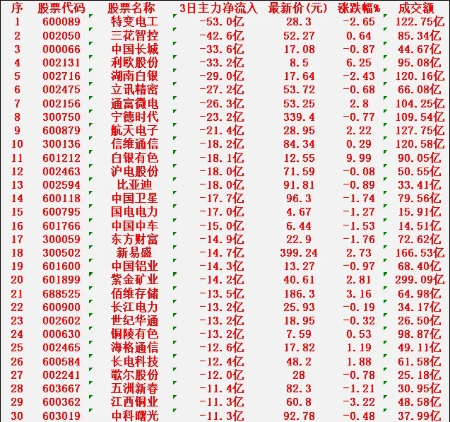 特变电工:净流入 -53.0亿元,最新价 28.30元