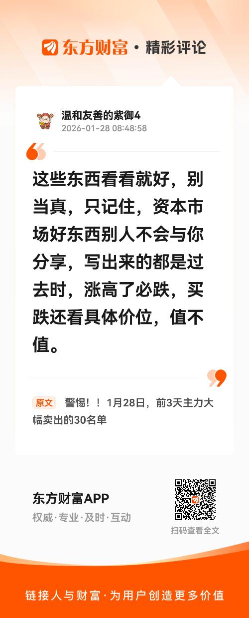 这些东西看看就好,别当真,只记住,资本市场好东西别人不会与你分享,写出来的都是过去时,涨高了必跌,买跌还看具体价位,值不值。 我在《警惕!!1月28日,前3天主力大幅卖出的30名单》的评论获得了大家的关注。