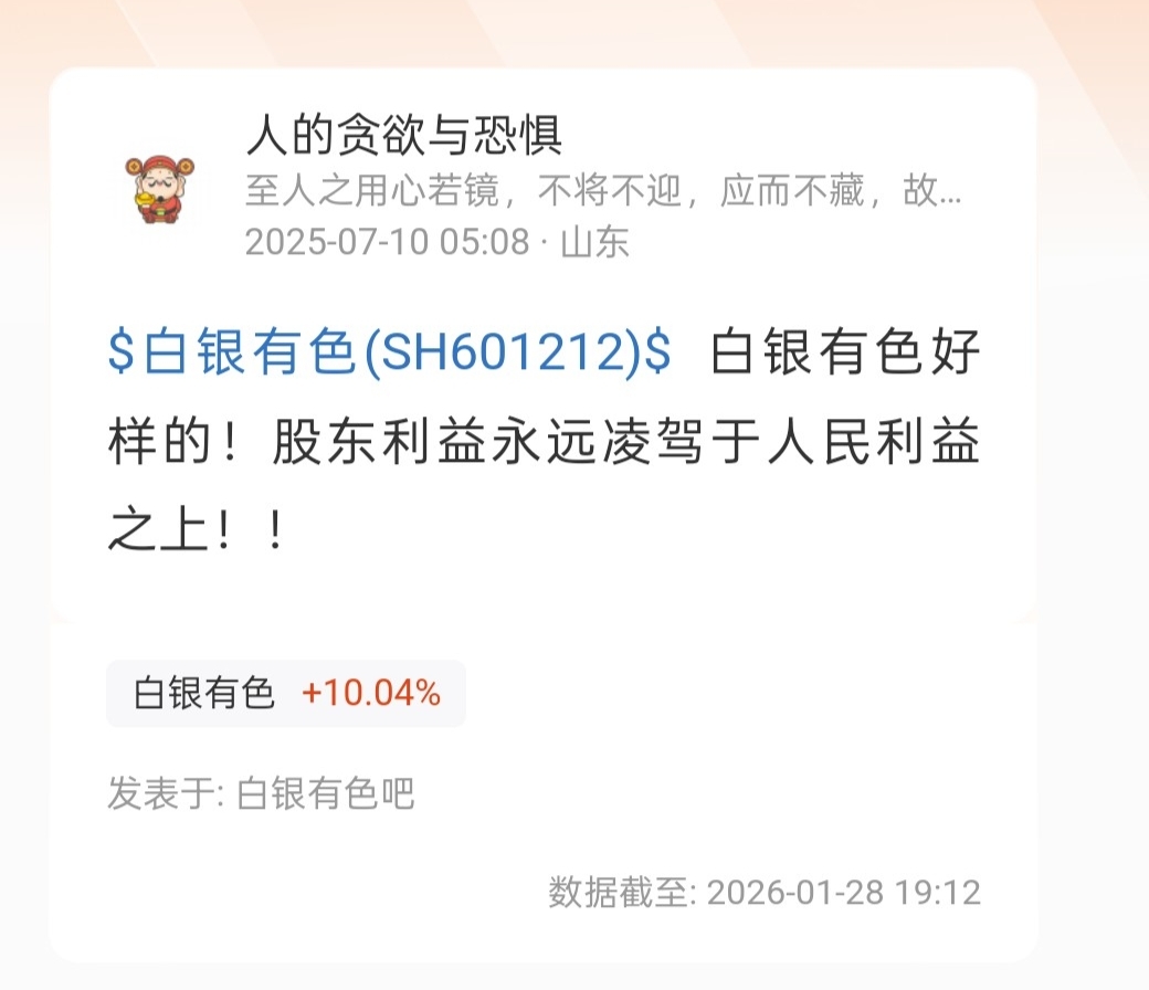 $白银有色(SH601212)$ 一语道破天机!!大声告诉我这句话什么水平??中国股神也不过如此吧!!一语道破天机!!股东利益永远凌驾于空枸利益之上!!