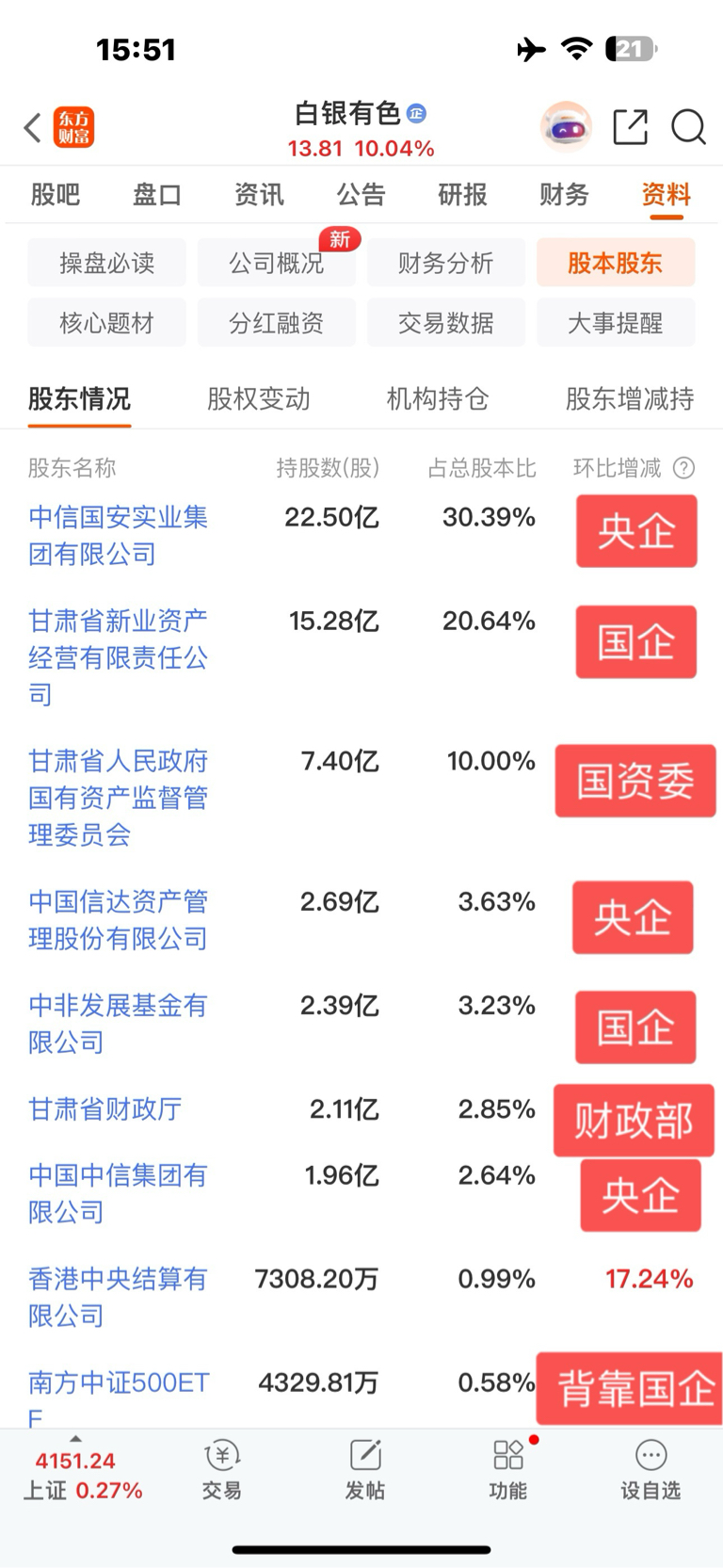 $白银有色(SH601212)$ 为什么白银有色这么牛逼,因为十大股东全是国家队,筹码都在他们手里