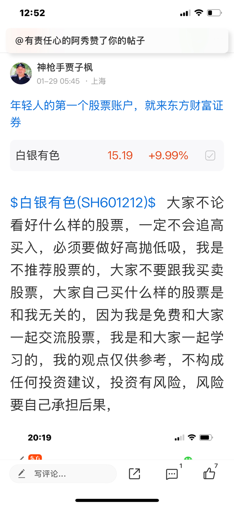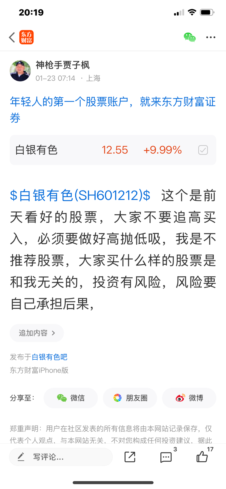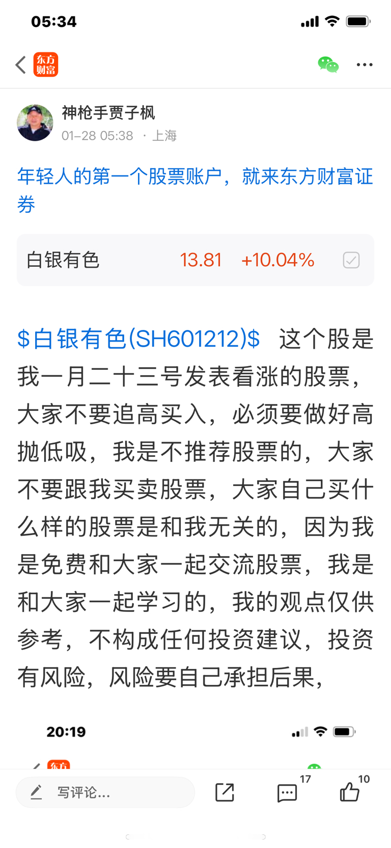 $白银有色(SH601212)$ 这个是我一月二十三号发表看涨的股票,大家不要追高买入,必须要做好高抛低吸,我是不推荐股票的,大家不要跟我买卖股票,大家自己买什么样的股票是和我无关的,我是免费和大家一起交流股票,我是和大家一起学习的,我的观点仅供参考,不构成任何投资建议,投资有风险,风险要自己承担后果,