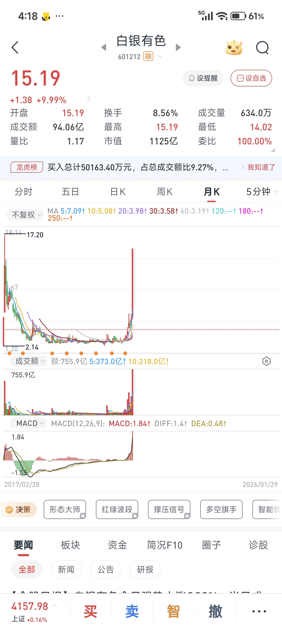 $白银有色(SH601212)$ 快跑历史高点附近再不跑套山顶,一辈子解不了套。