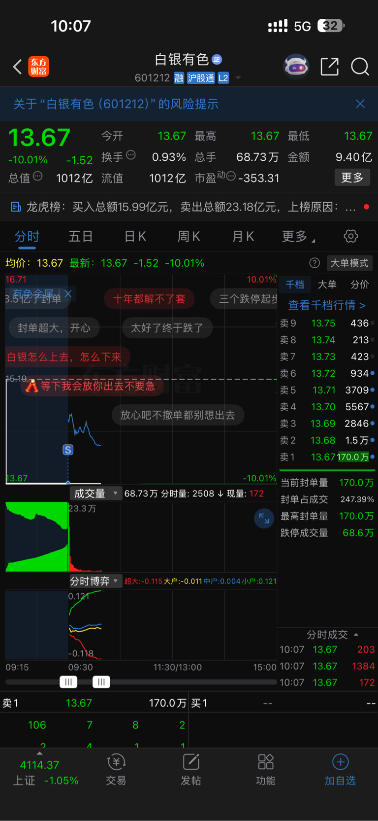 $白银有色(SH601212)$ 我集合竞价地板成功跑了.挂着锁利润.你们是不是都睡着了.我昨晚11.30看见黄金白银跳水给我心慌的立马就过来了.就这样都是在集合进价最后那小块出去的.今天咱也出不去,再吃一个哎.连我朋友一个不玩股票的都知道买黄金白银都能随便挣.谁还上班了.情绪到这个地步就该撤退了.我卖了80%,还留了一点仓位继续看.先锁住利润的大头.剩下的随便他怎么样.时刻畏惧吧m