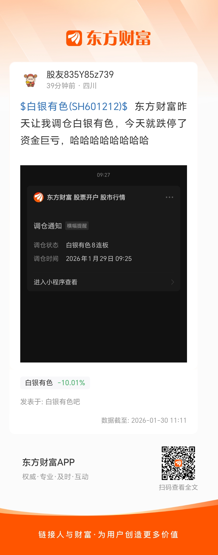 $白银有色(SH601212)$  东方财富昨天让我调仓白银有色,今天就跌停了资金巨亏,哈哈哈哈哈哈哈哈