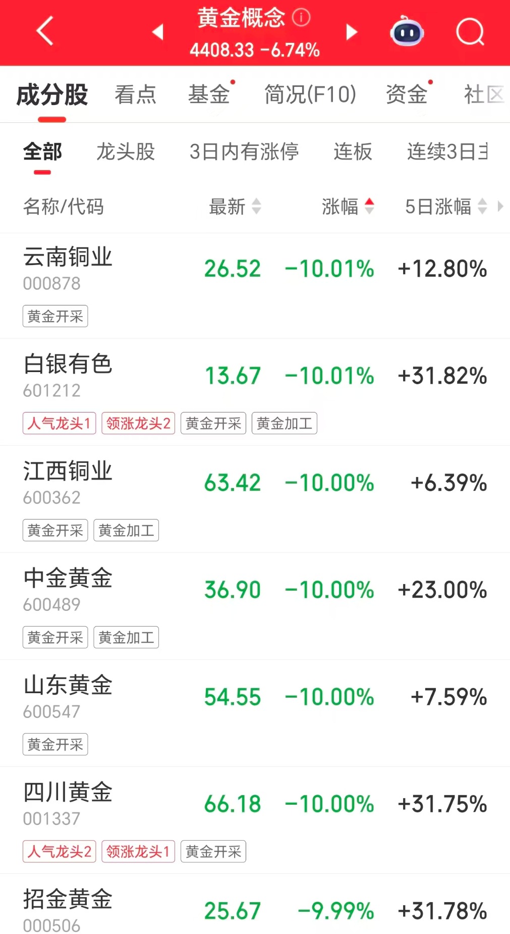 同日,A股黄金概念板块掀“跌停潮”。云南铜矿、白银有色、江西铜业、中金黄金、山东黄金、四川黄金、招金黄金、西部矿业等大面积跌停。
