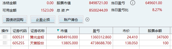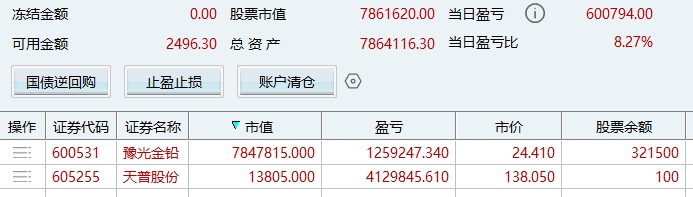 盘的所有的账户继续满仓格局600531不动,不动30不走,今天的大幅波动洗掉了一大批人,为后面更大的空间扫平障碍,所谓的买在分歧就是指今天这种行情。600531是白银黄金大涨最受益标的之一,是真正的补涨龙头,白银收入一年一百多亿,在所有的上市公司里面排名第一位,目前不到300亿市值,到500亿市值没有问题,可以参考对标同板块的002716(目前580亿市值)和601212(目前1125亿市值)。这也是我所有的账户全部满仓它的原因,上次所有的账户满仓的605255我翻倍出来了,看看这次能否继续创造奇迹和辉煌,再次让我一战成名。