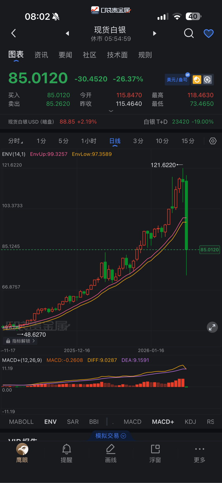 黄金,白银期货昨晚最多跌36个点,收盘跌26个点。自带5倍杠杆,估计无数人爆仓一