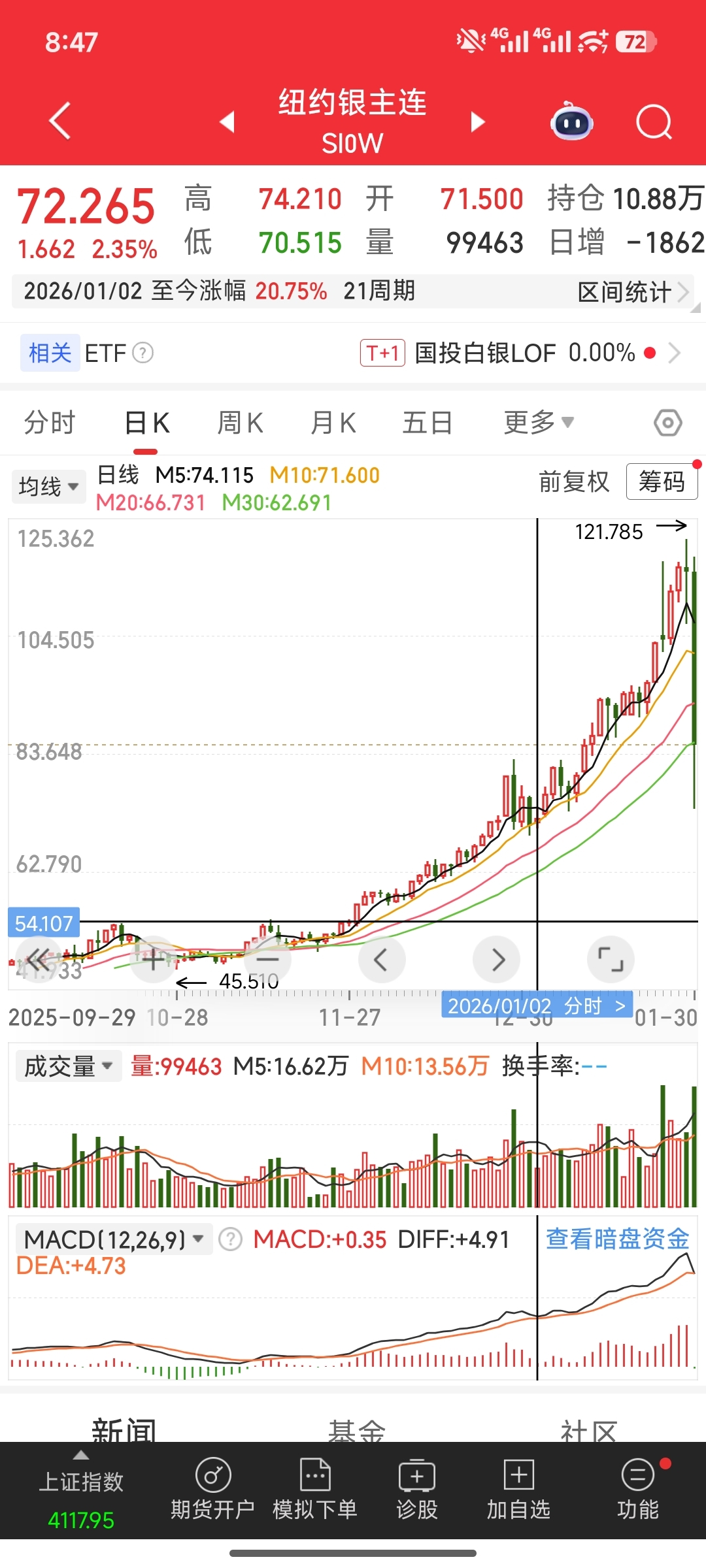 昨晚白银跌到74,是1.2号的价格,所以白银有色也要跌回1.2号的价格5块钱