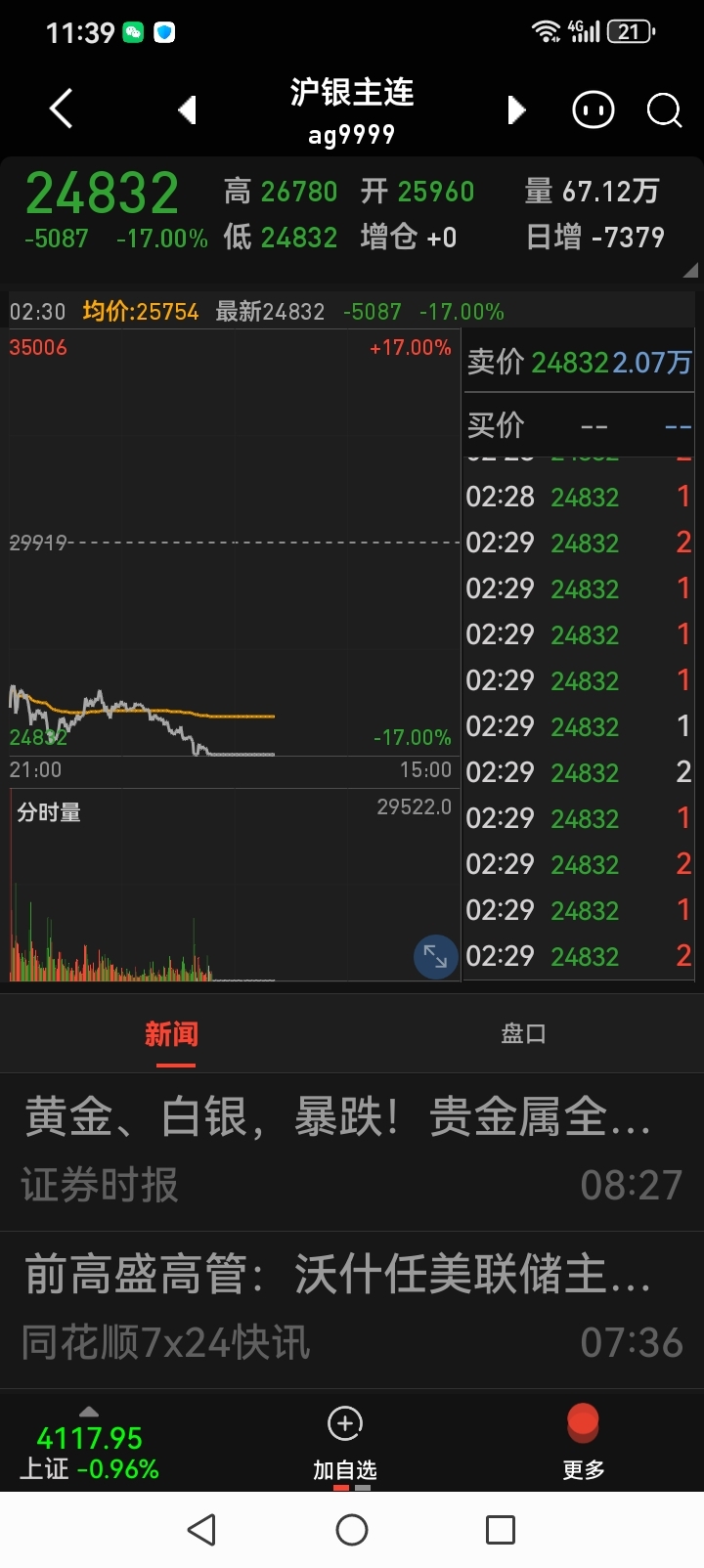 $白银有色(SH601212)$ 完了,白银期货都跌停板了,礼拜一这股票是出不去了。后悔了,剩1000股留着没舍得卖