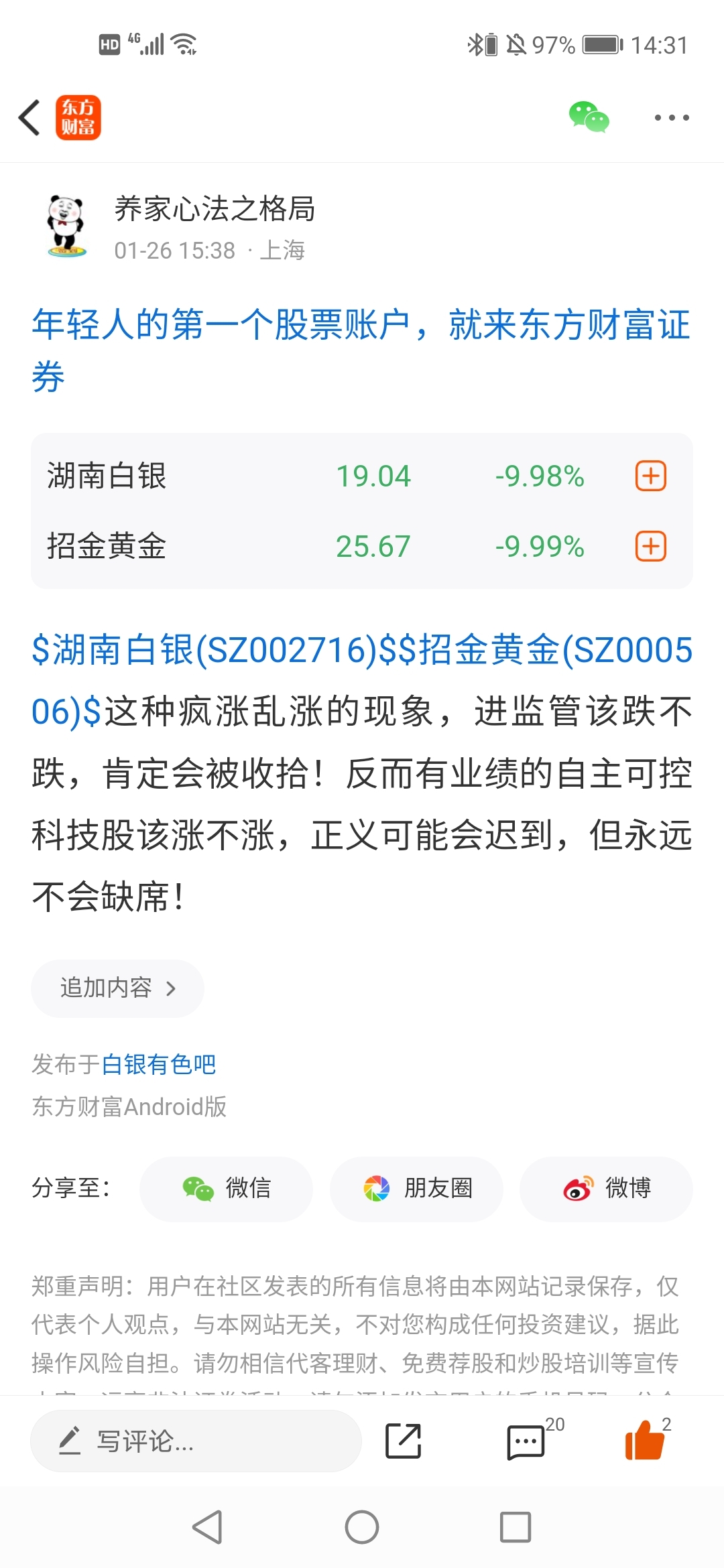 温馨提示: 1.根据《证券法》规定,禁止编造、传播虚假信息或者误导性信息,扰乱证券市场;2.用户在本社区发表的所有资料、言论等仅代表个人观点,与本网站立场无关,不对您构成任何投资建议。用户应基于自己的独立判断,自行决定证券投资并承担相应风险。《东方财富社区管理规定》