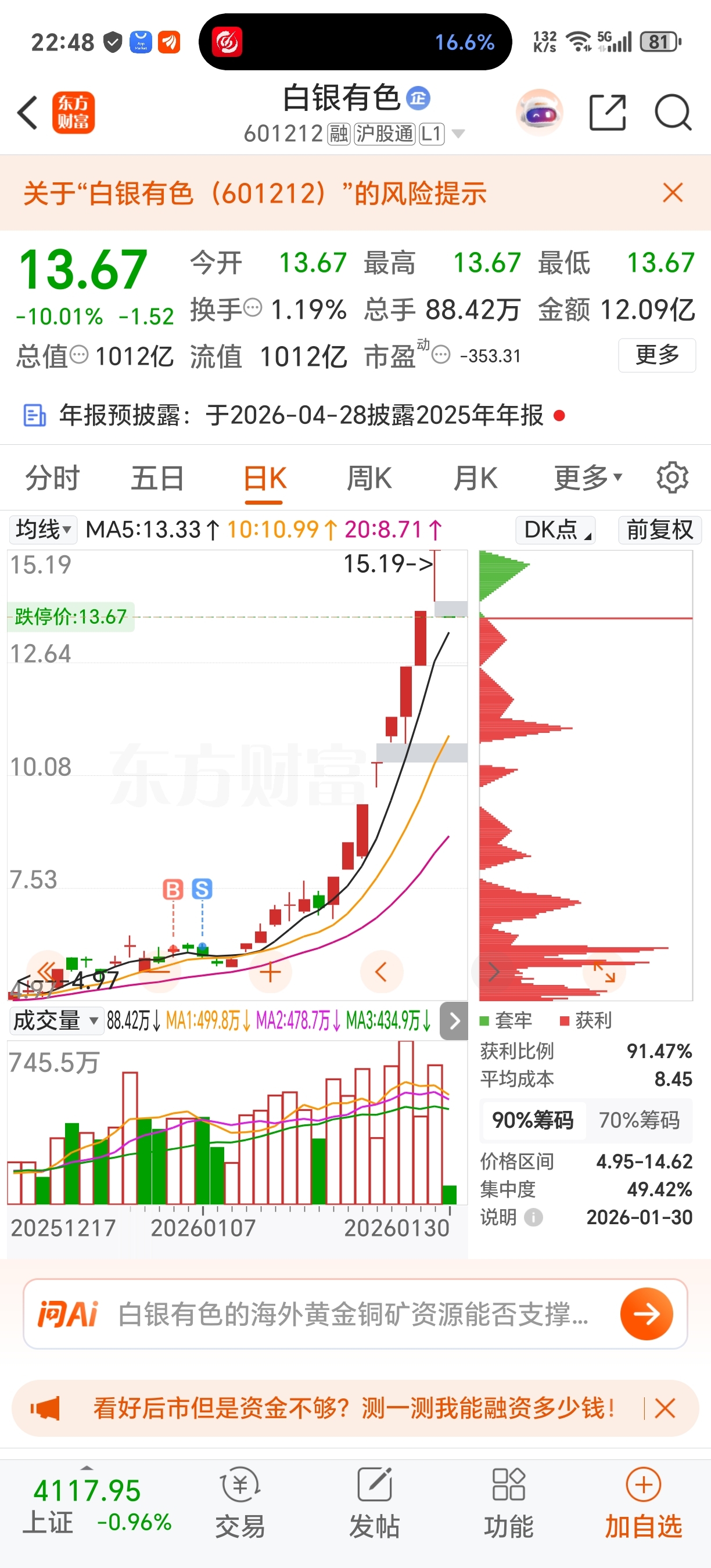 $白银有色(SH601212)$ 我只拿了一天,第二天就开启了行情,唉!没有你们那好命