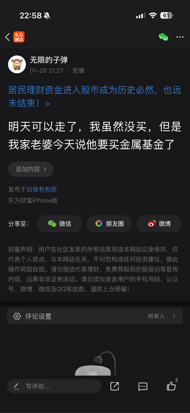 温馨提示: 1.根据《证券法》规定,禁止编造、传播虚假信息或者误导性信息,扰乱证券市场;2.用户在本社区发表的所有资料、言论等仅代表个人观点,与本网站立场无关,不对您构成任何投资建议。用户应基于自己的独立判断,自行决定证券投资并承担相应风险。《东方财富社区管理规定》