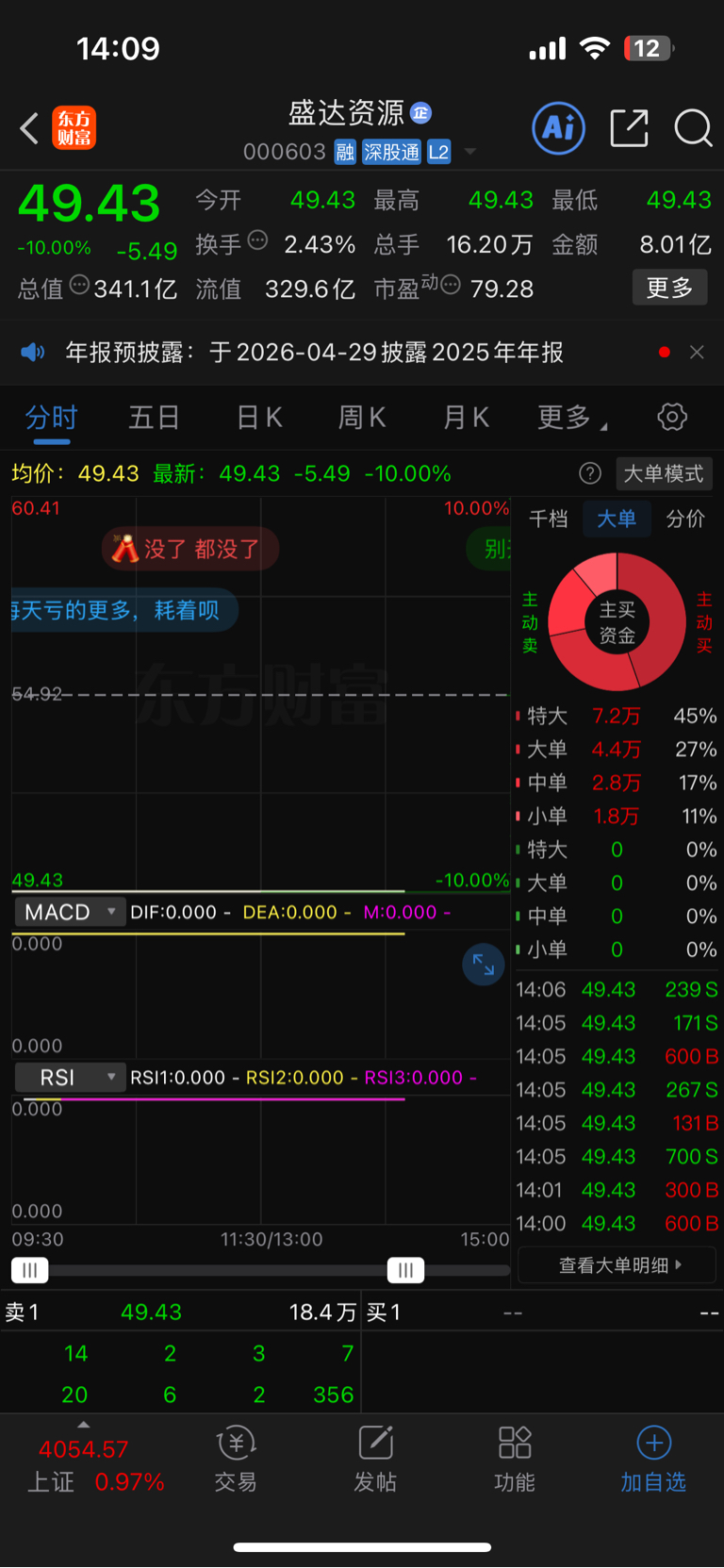 白银各种渠道都找不到合适的投资标的,只好来买一个白银龙头企业了。他已经一字跌停几天了。外盘上涨10%,他跌停板没有道理呀。今天下午看到他有大量超大单坐吸筹。本来还想看一天的,算了不等了,跌停价冲进去上车了。另外黄金今天买了总资金的15%