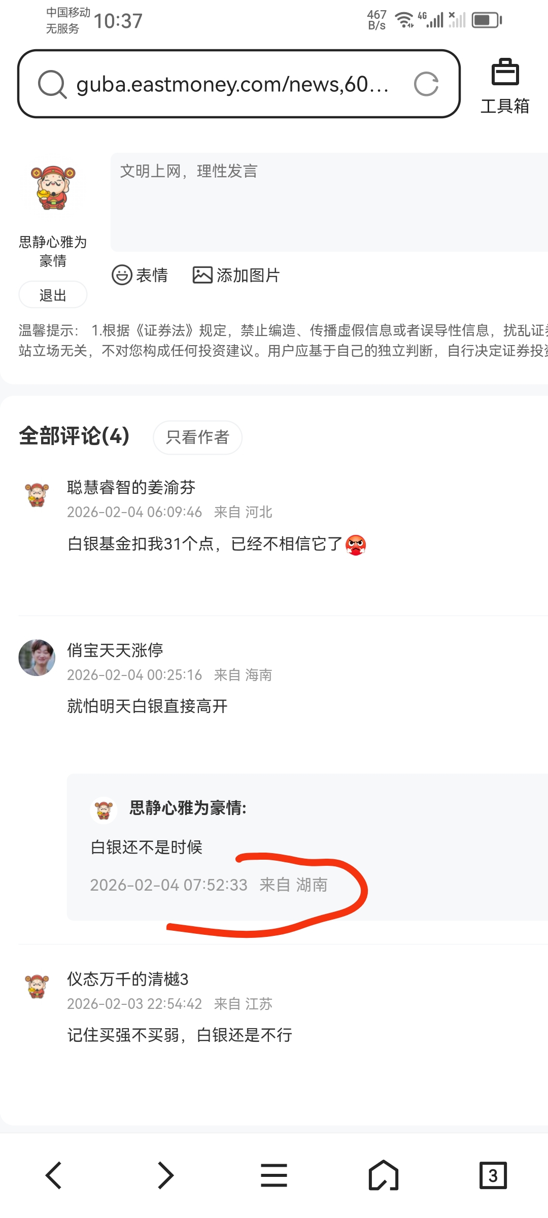 温馨提示: 1.根据《证券法》规定,禁止编造、传播虚假信息或者误导性信息,扰乱证券市场;2.用户在本社区发表的所有资料、言论等仅代表个人观点,与本网站立场无关,不对您构成任何投资建议。用户应基于自己的独立判断,自行决定证券投资并承担相应风险。《东方财富社区管理规定》