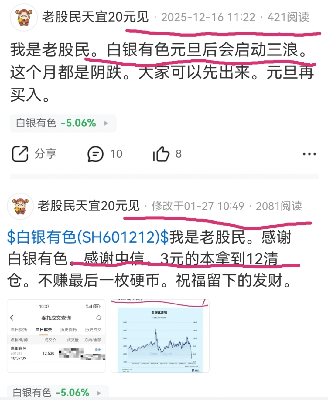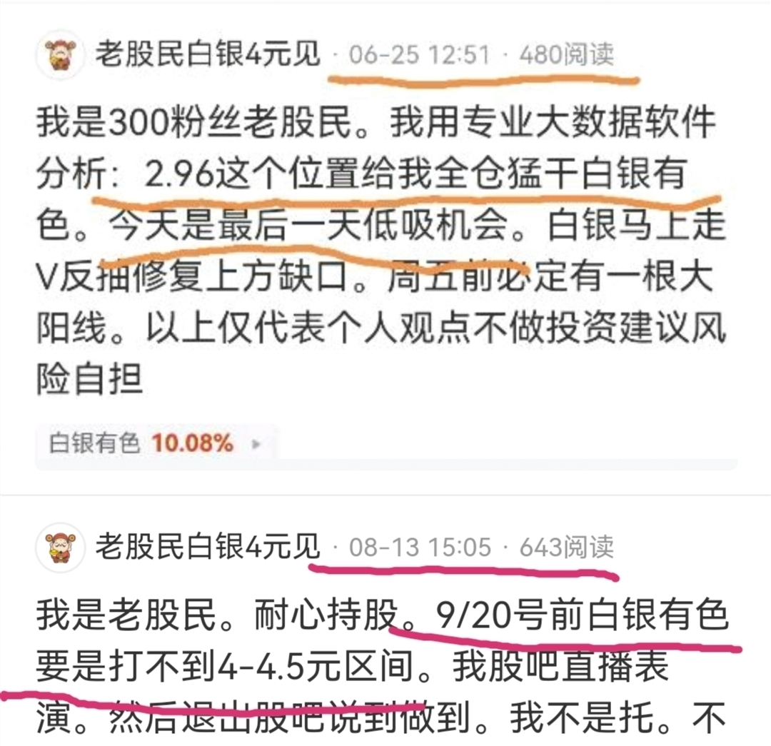 我是老股民。从去年六月发帖提醒三元买入白银有色。一路格局。叫大家坚定持股拿到12
