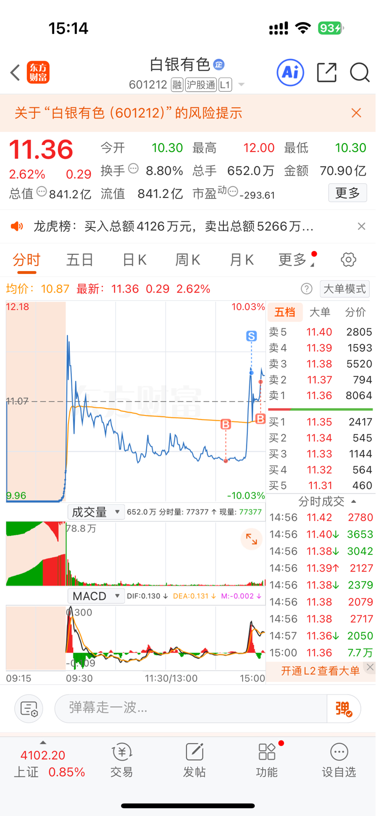 $白银有色(SH601212)$ 错过了早上,于是下午做t回了下血,最后笔是为了搏个明日冲高