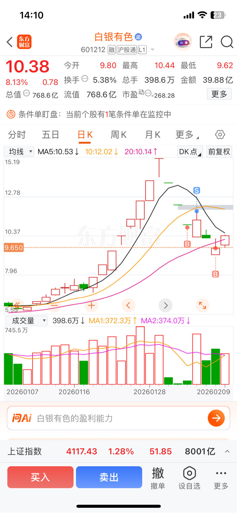 $白银有色(SH601212)$ 二进宫。条件单10.50卖出。