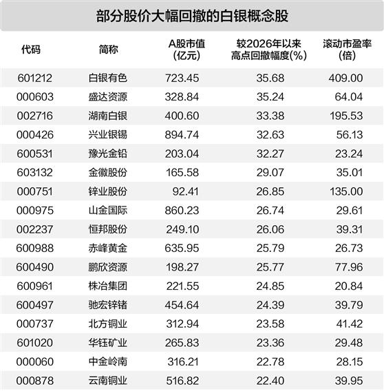 国际银价大幅回撤近30%,白银概念股走势也随之调整。据数据宝统计,以2月11日收盘价与今年内高点相比,超八成概念股回撤幅度在20%以上。白银有色、盛达资源、湖南白银、兴业银锡、豫光金铅等回撤幅度逾30%。