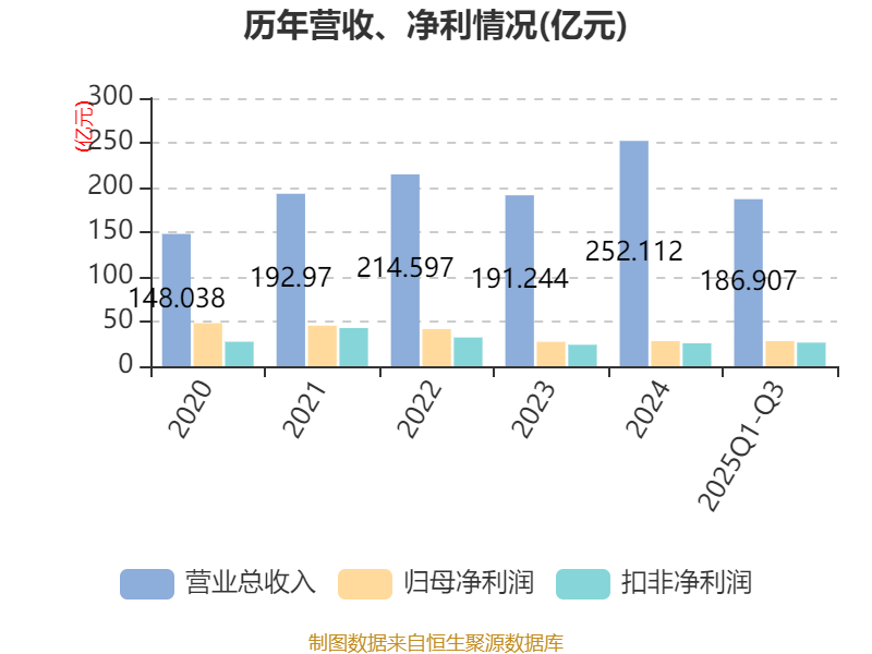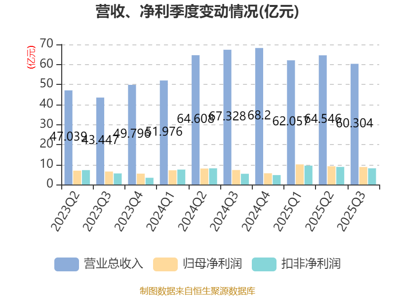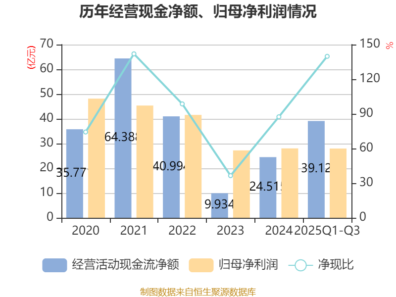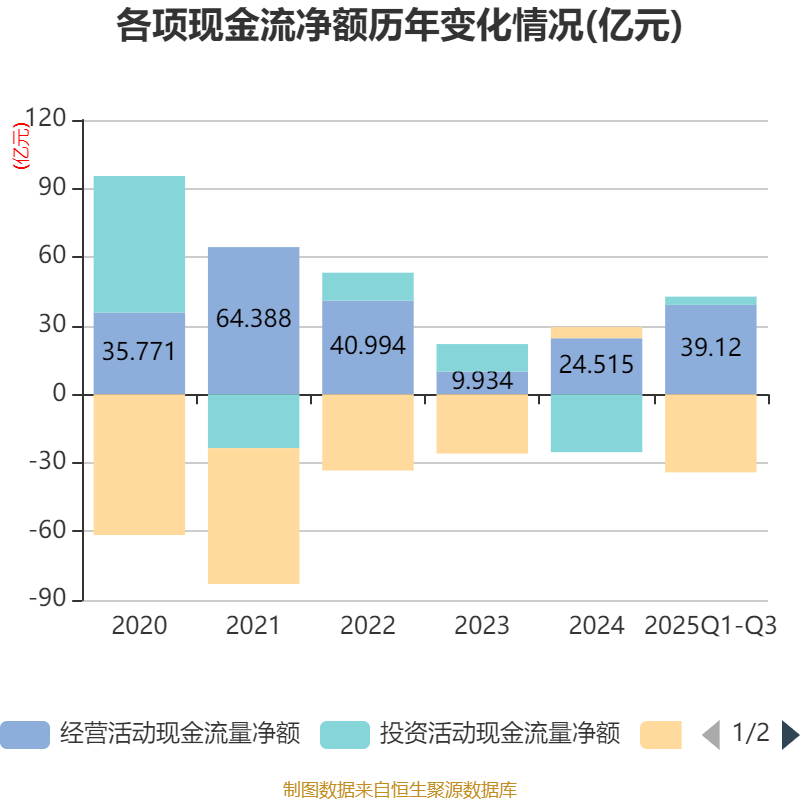 2025年前三季度,公司经营活动现金流净额为39.12亿元,同比增长201.75%;筹资活动现金流净额-34.15亿元,同比减少43.28亿元;投资活动现金流净额3.59亿元,上年同期为-19.72亿元。