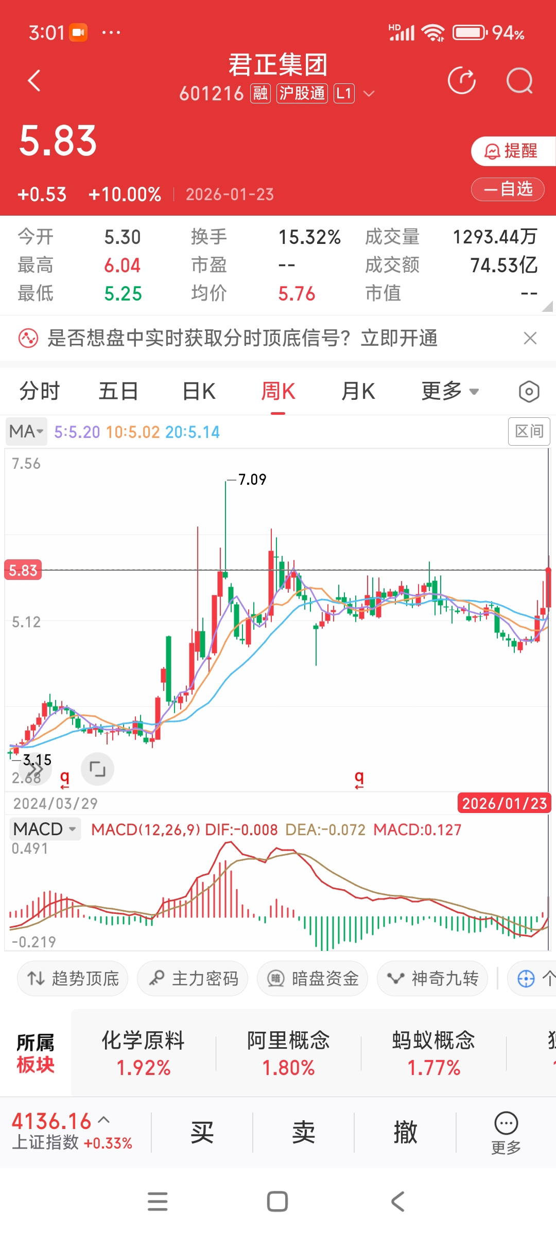 君正本周大涨了10%。完完全全走好了,开始上升通道了。饭一口一口吃,路一步一步走