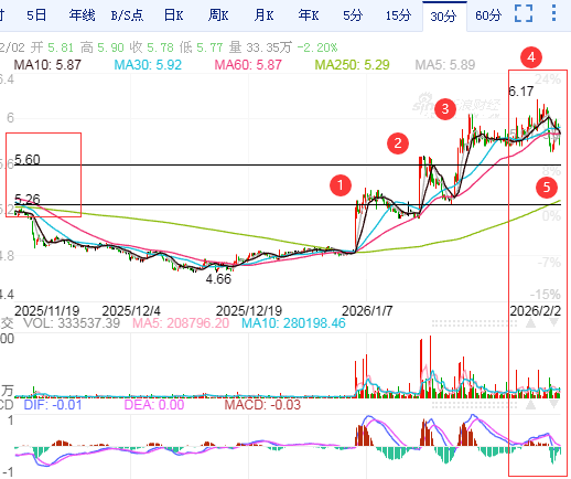 30分钟如期顶背离,大概回调到5.6博反弹(理想是继续创新高过6.17),悲观角度就是回到5.3左右,总之必然会反弹上去,只是时间问题