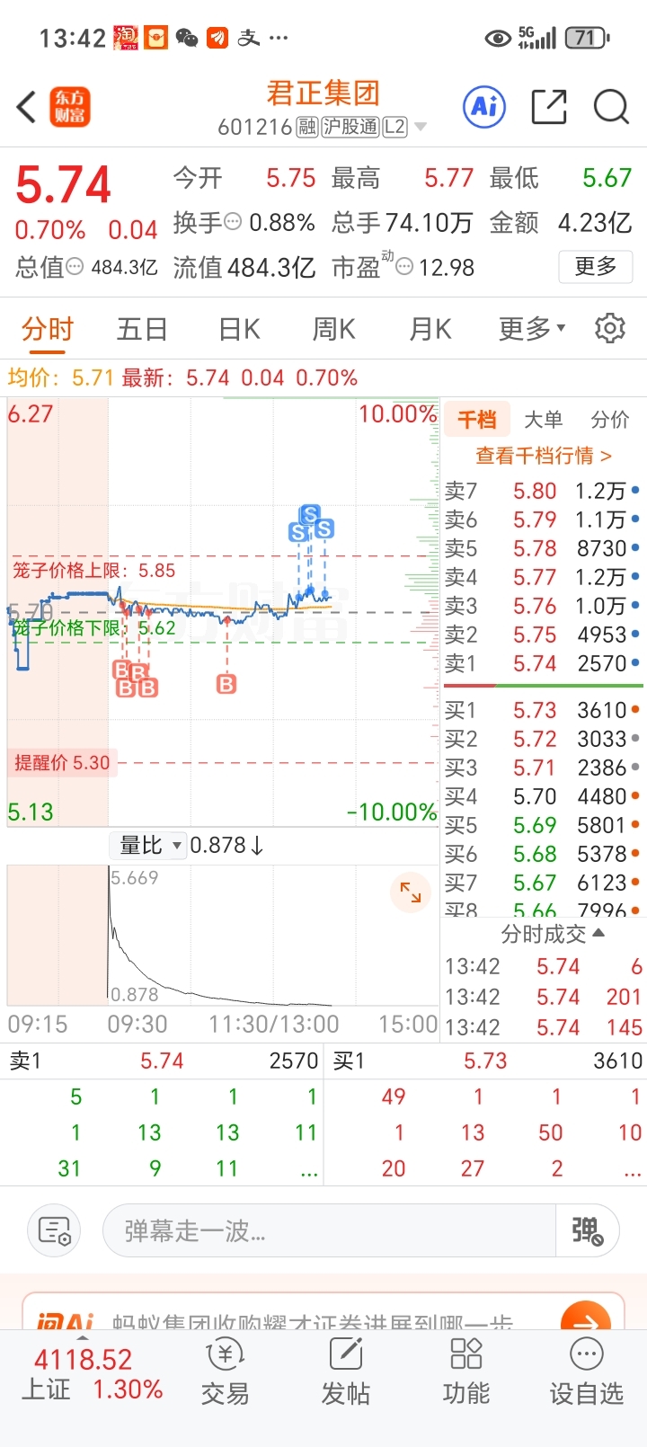 $君正集团(SH601216)$ 今天6.32继续减仓东方电热,5.7和5.68分别加仓君正,5.76开始减仓君正,主力碰到我们这些中户也是头疼,沙下来买,涨上去要抛,主力应该一把涨停才让我买不到!