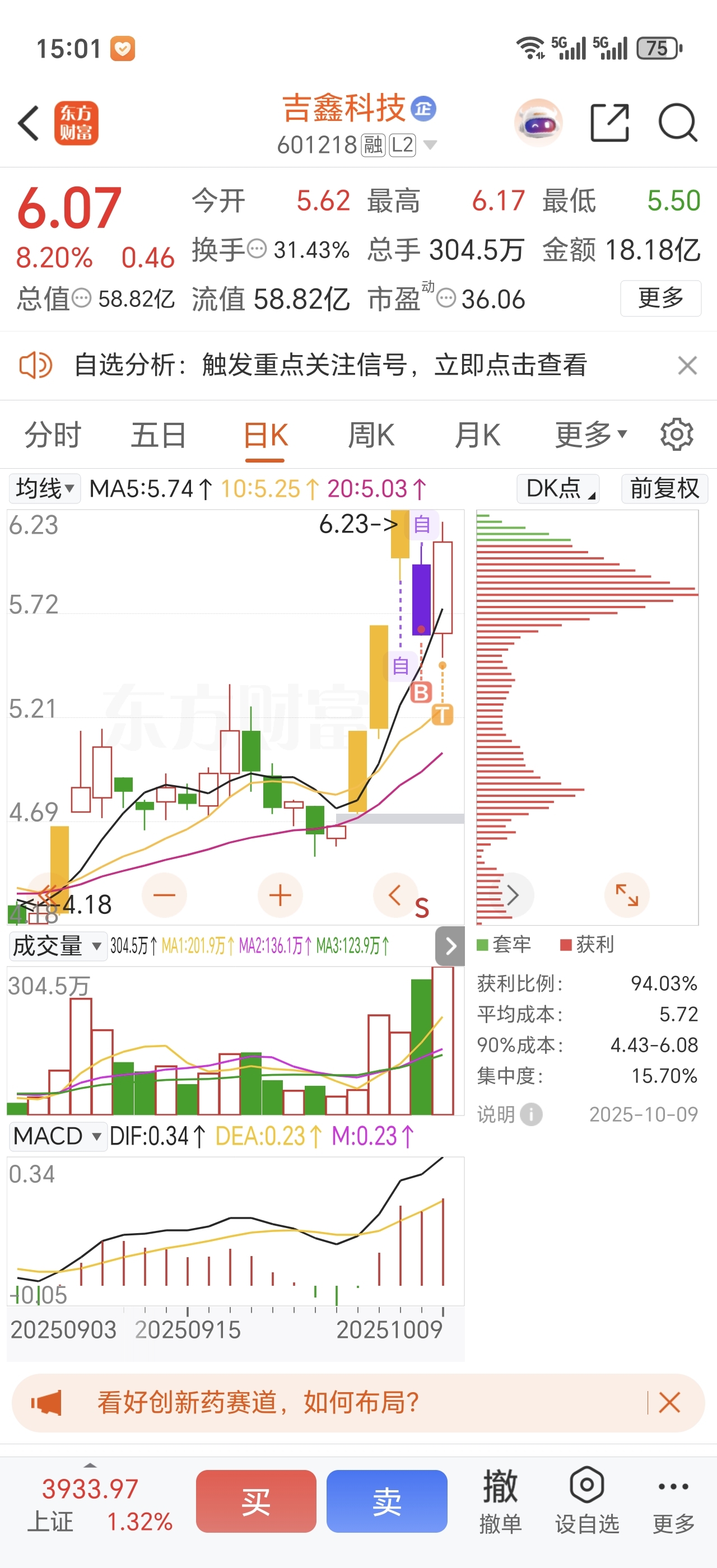 节前在吉鑫留了底仓,早上反手进了吉鑫科技。