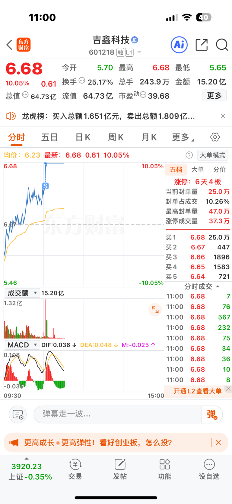 $吉鑫科技(SH601218)$ 早上跌六个点挂的涨停板就两个小时没看主力我不想下车快回来接我啊