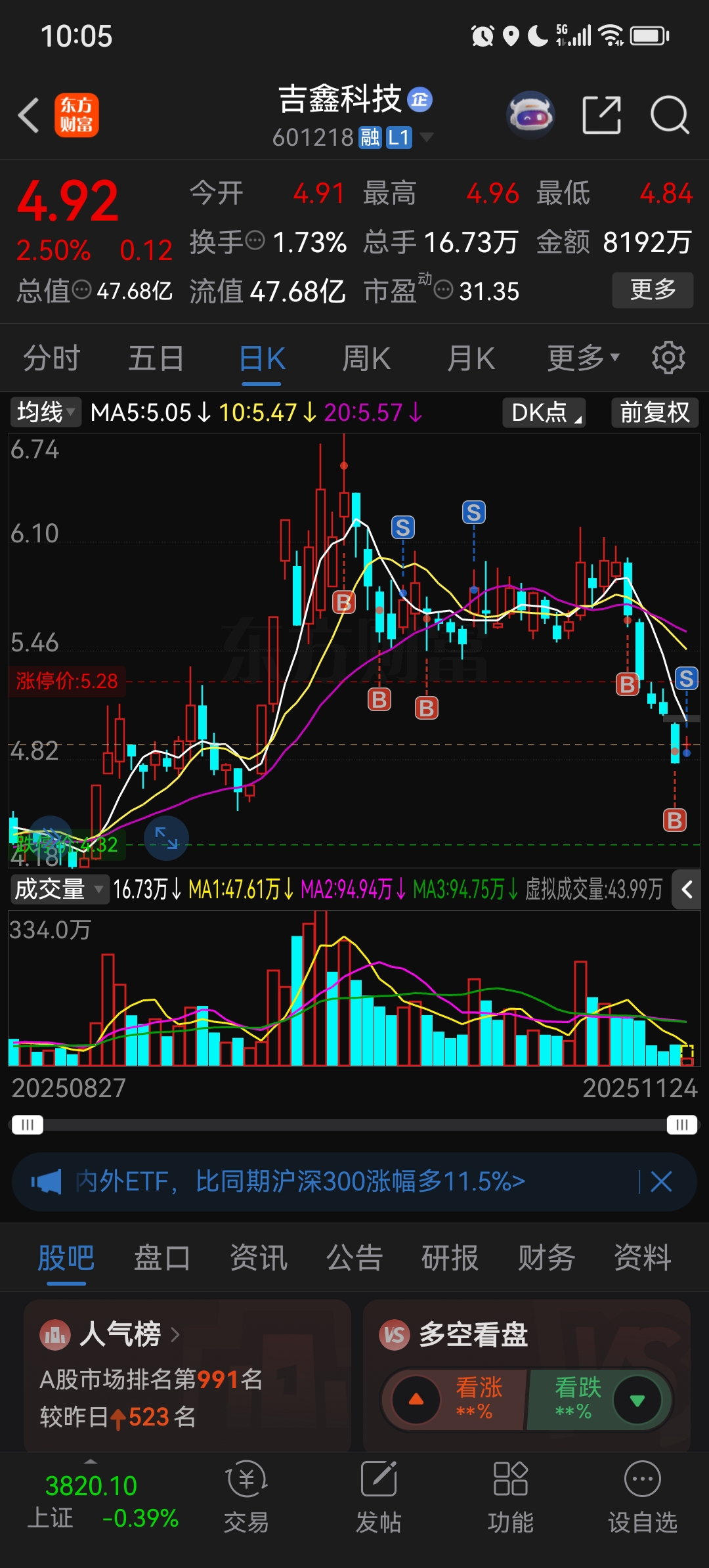 $吉鑫科技(SH601218)$ 己清仓了。你可以涨了。套在了最高点