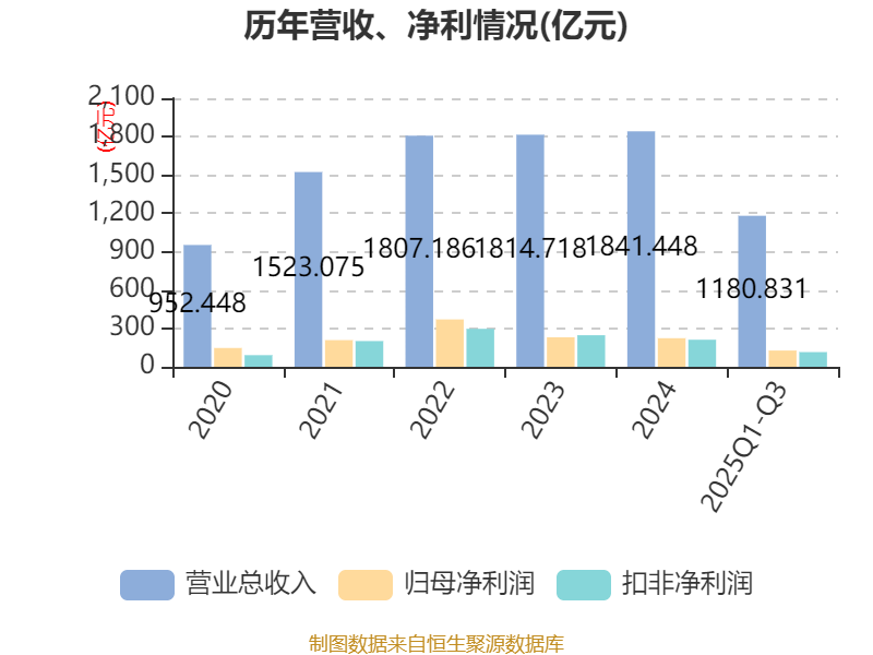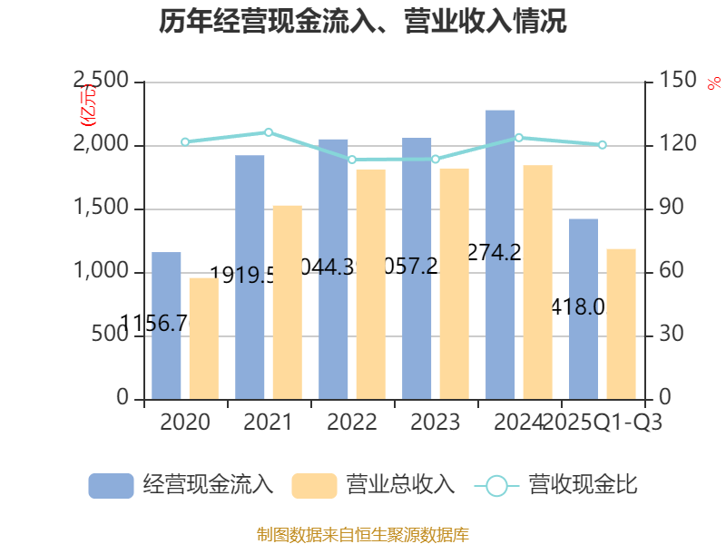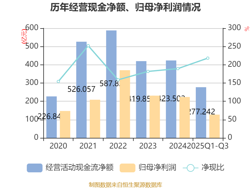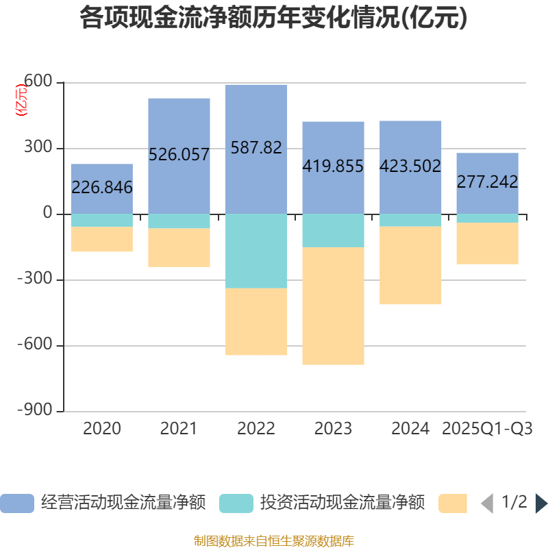 2025年前三季度,公司经营活动现金流净额为277.24亿元,同比下降26.86%;筹资活动现金流净额-189.2亿元,同比减少8.29亿元;投资活动现金流净额-41.13亿元,上年同期为-49.26亿元。