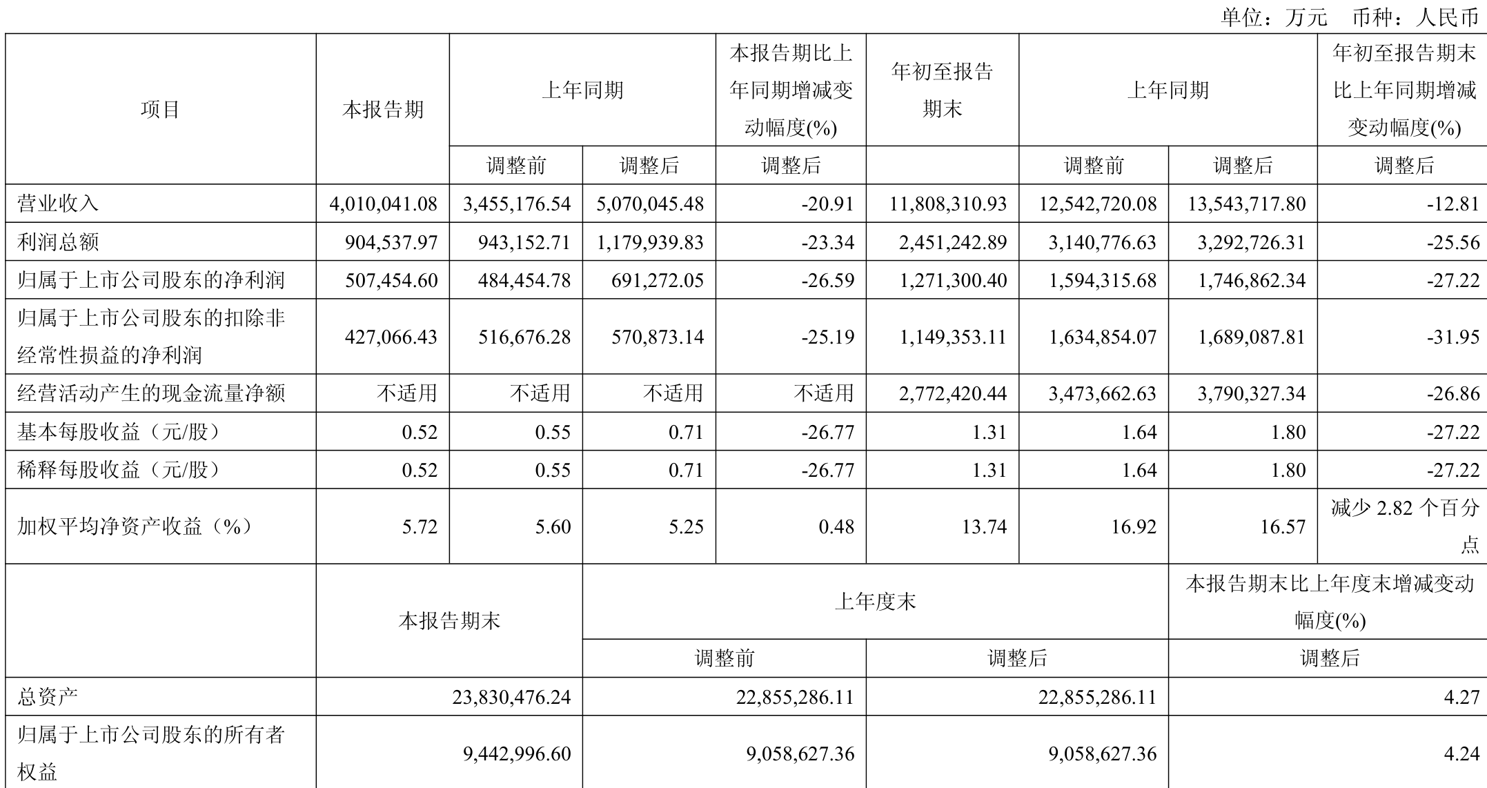中证智能财讯陕西煤业(601225)10月30日披露2025年第三季度报告。前三季度公司实现营业总收入1180.83亿元,同比下降12.81%;归母净利润127.13亿元,同比下降27.22%;扣非净利润114.94亿元,同比下降31.95%;经营活动产生的现金流量净额为277.24亿元,同比下降26.86%;报告期内,陕西煤业基本每股收益为1.31元,加权平均净资产收益率为13.74%。