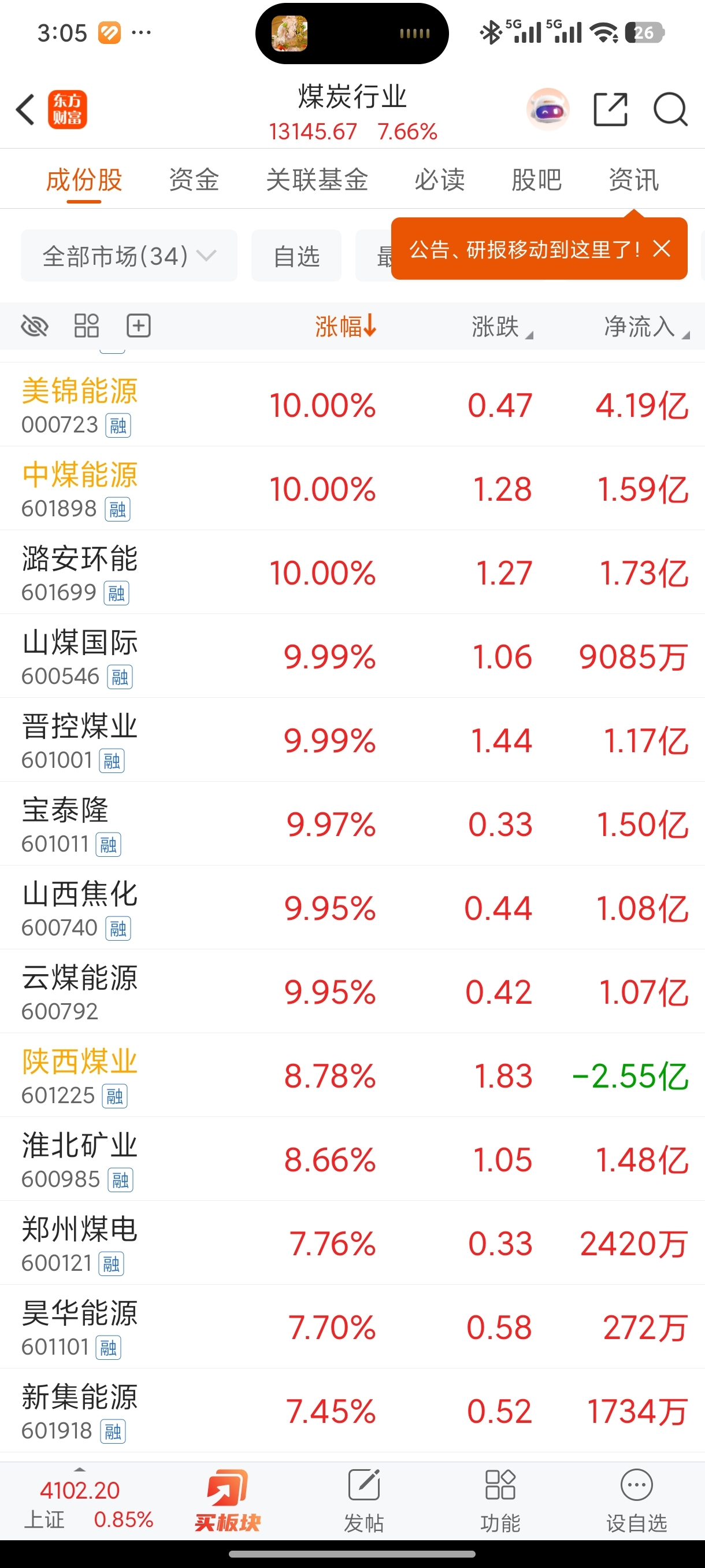 $陕西煤业(SH601225)$ 请教高手,今日煤炭板块普涨,涨幅大的这些资金净流入都是正的,为什么只有涨了但是资金净流入为负???另外看着陕煤今天卖盘巨大,最后也无力涨停。不知明天会不会大幅回落?