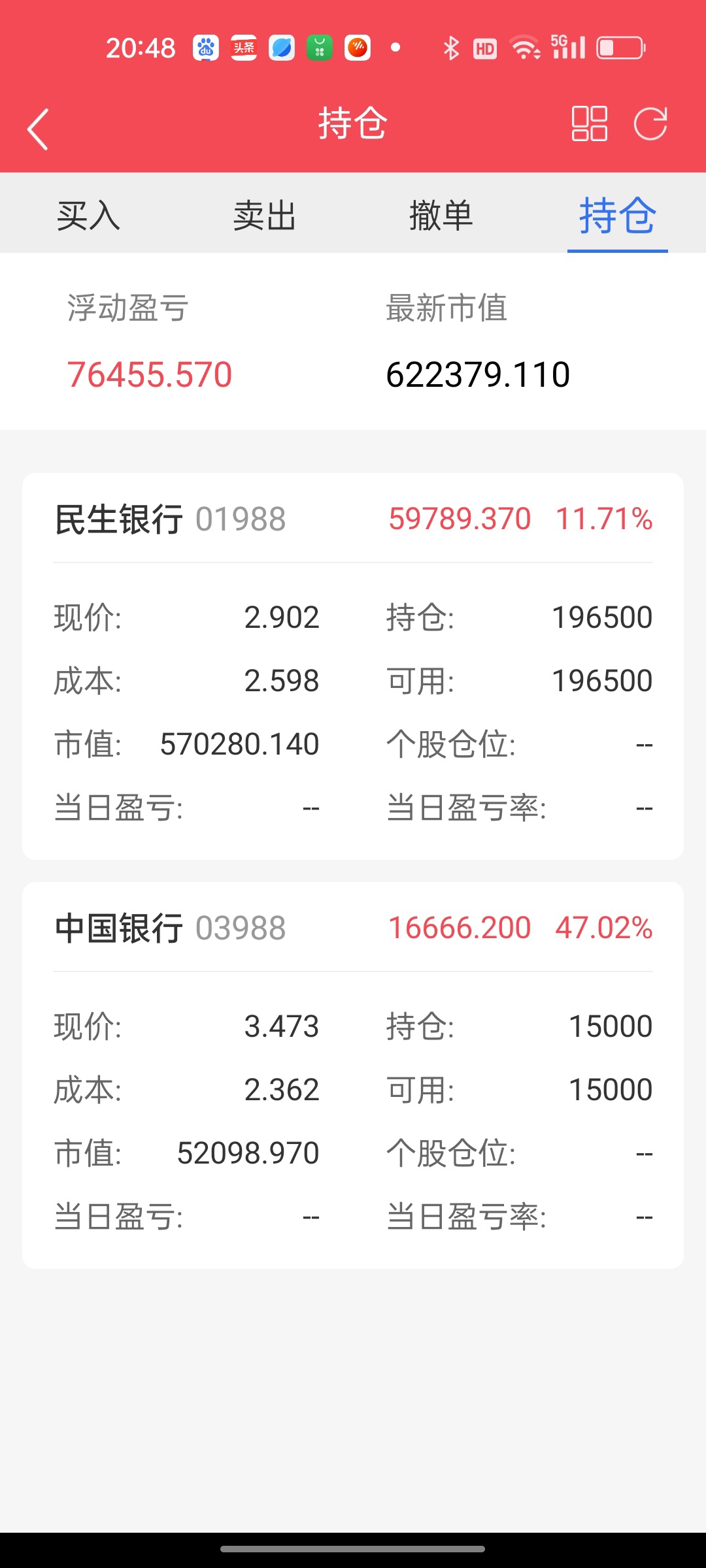 $广州港(SH601228)$ 疫情前持仓至今的老朋友,来报到!我5元建仓,反复加仓做T,赚了二万,不到5元不清仓!这里安全,但是赚不了钱呀。在外这6年赚了100w。去年七月,三个帐户民生银行H。