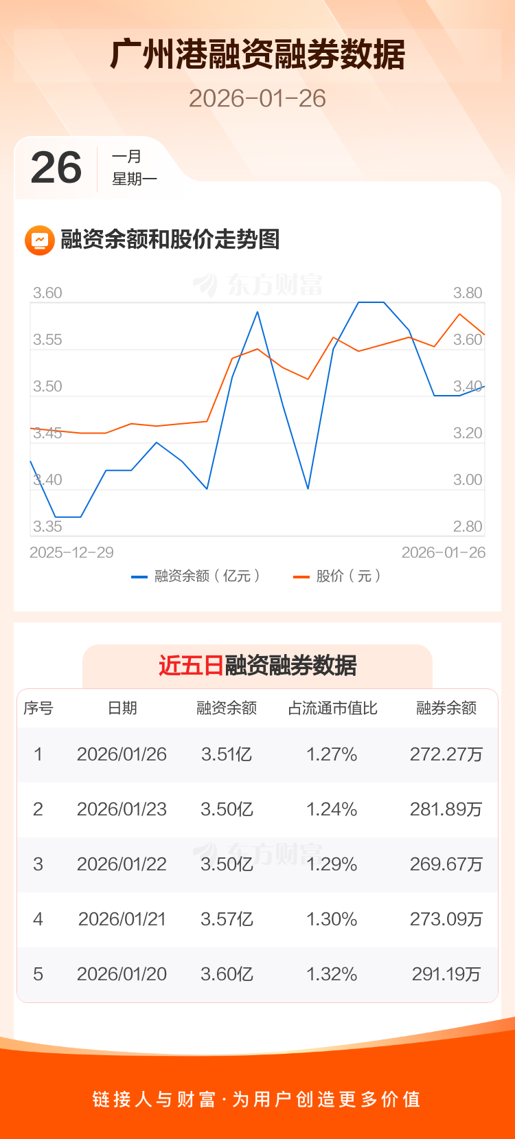 交易所最新数据显示,广州港于2026年1月26日获融资买入1903.27万元,融资偿还1835.29万元,当日融资净买入67.97万元。目前,该股融资余额3.51亿,占流通市值比例为1.27%。