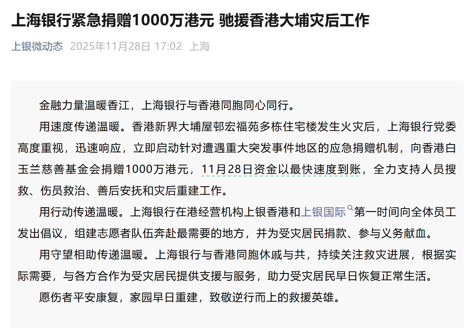 上海银行紧急捐赠1000万港元,驰援香港大埔灾后重建工作