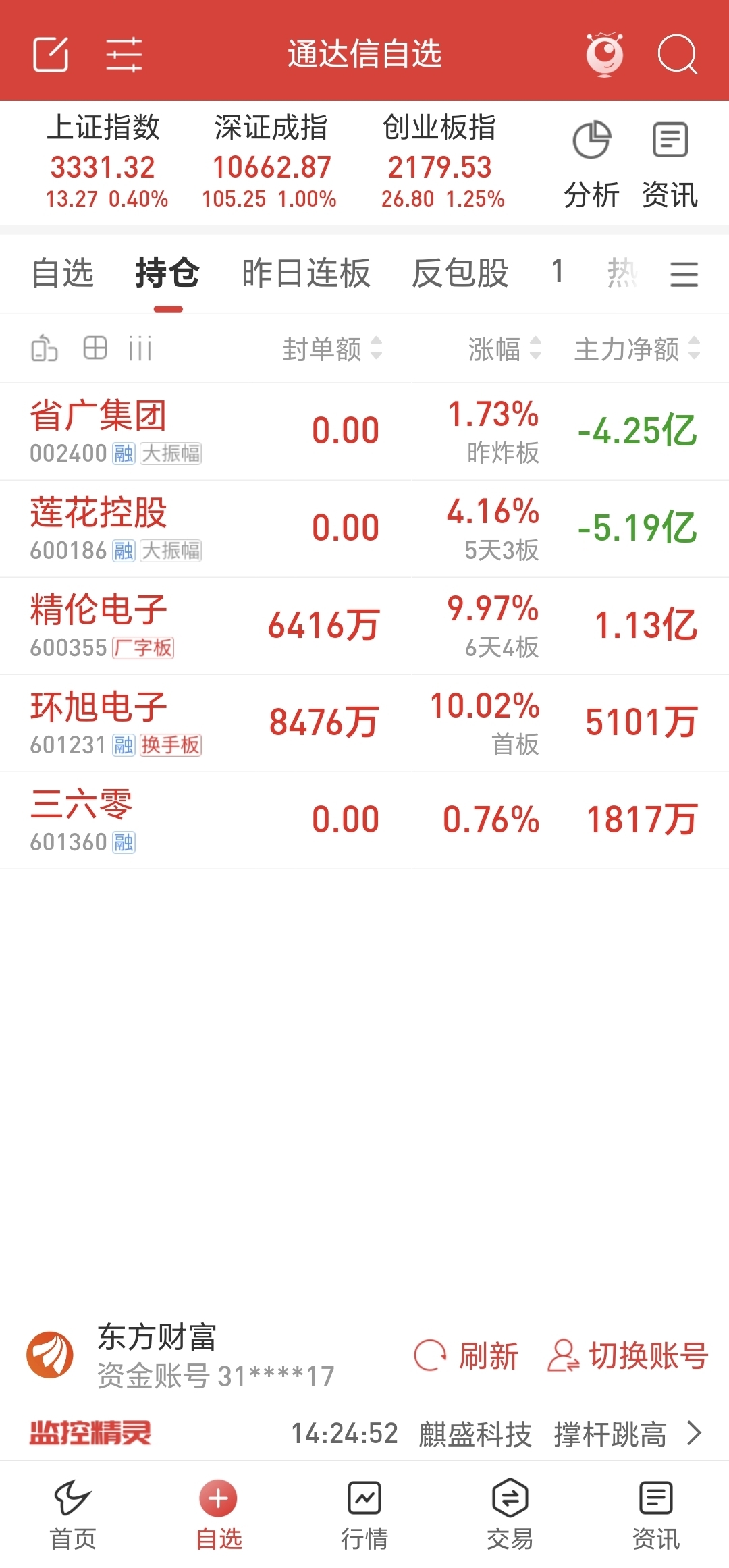 2月12日:昨日持仓处理:精伦电子:8个点卖飞了。莲花控股:冲高6个点跑路。省广